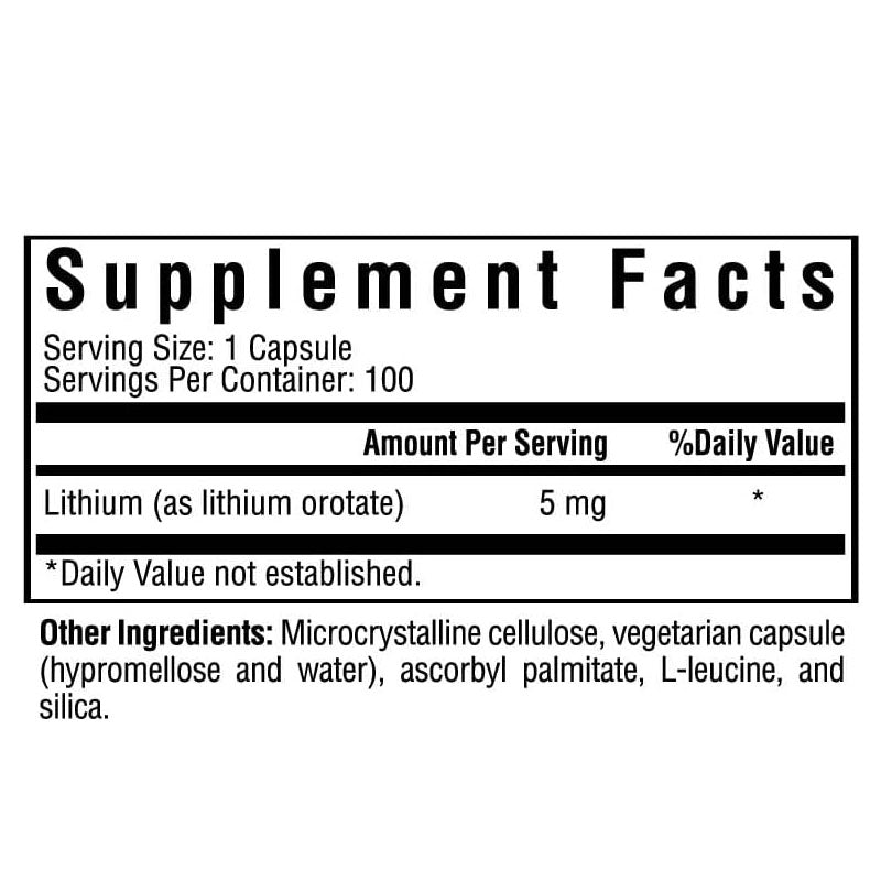 Lithium Orotate provides a low serving of lithium (5 mg per capsule). This type of lithium is attached to the natural compound orotic acid for optimal bioavailability and efficient absorption.*