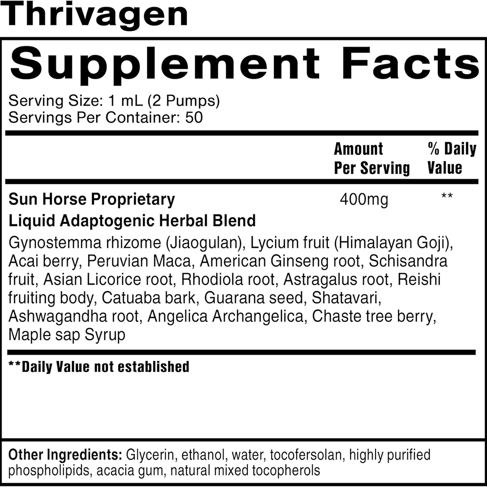 Thrivagen is a liposomal supplement for women with energy, adrenal, and balance-supporting botanicals. It contains 15 herbs, including ginseng, shatavari, maca, and chaste tree berry.